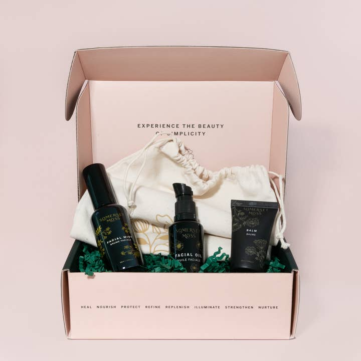 TheΒ Core Collection Kit by Somerset Moss is a beautifully curated trio designed to simplify your skincare routine while delivering profound results. Featuring the Facial Mist, Facial Oil, and Facial Balm, this set forms a harmonious ritual that hydrates, restores, and protects your skin barrier β all packaged in a signature Somerset Moss drawstring bag for effortless travel and gift-ready presentation.