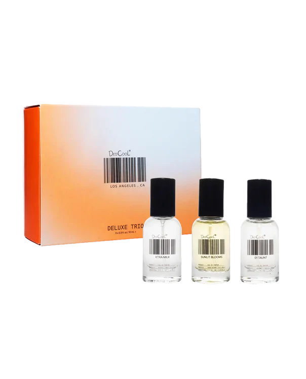 The DedCool Deluxe Trio Set invites you to explore the sensory world of DedCool with three of their cult-favorite fragrances: XTRA MILK, TAUNT, and SUNLIT BLOOMS — each in a generous 10mL deluxe spray, perfect for travel, gifting, or curating your personal scent signature.