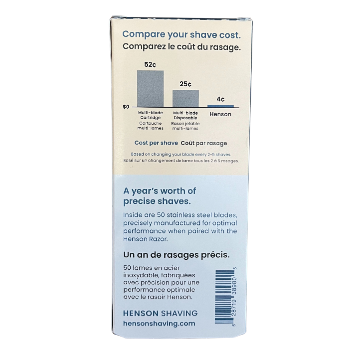 Upgrade your shaving ritual with Henson Shaving Double Edge Blades — a 50-pack, one-year supply of precision stainless steel blades crafted for the closest, smoothest, and most sustainable shave.